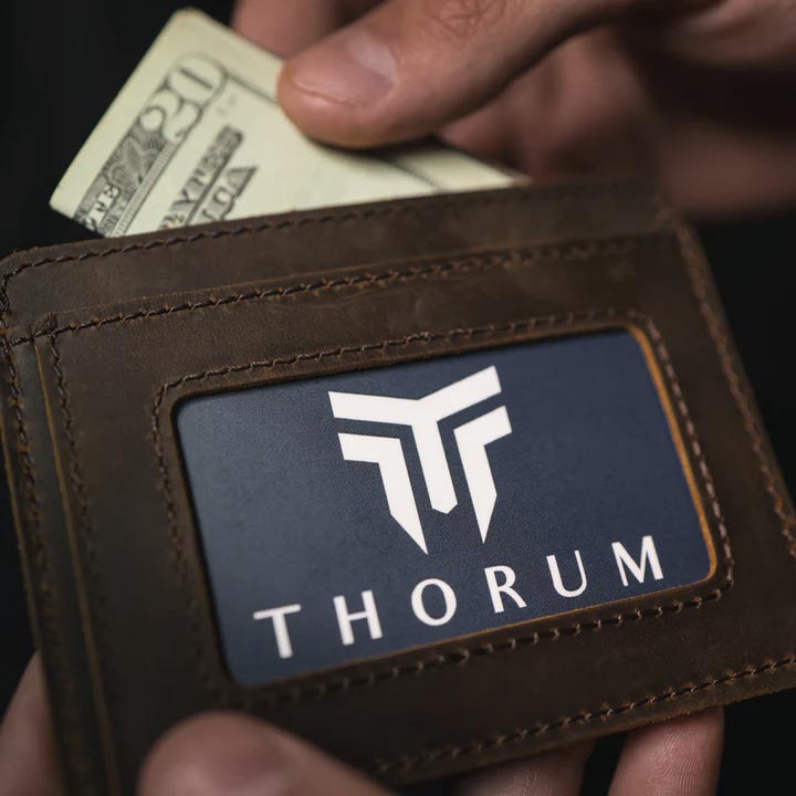 The Martin wallet by Thorum. Minimalism meets quality in this EDC front-pocket leather wallet. Be ensured that you are secure with this slim, full grain leather wallet that is RFID lined! Built in Nashville, TN this leather wallet will turn heads and keep your ID, credit/debit cards, and cash secure for a lifetime. Thorum took over a year and a half to make the perfect wallet that you can use everyday. Backed by a lifetime warranty.